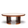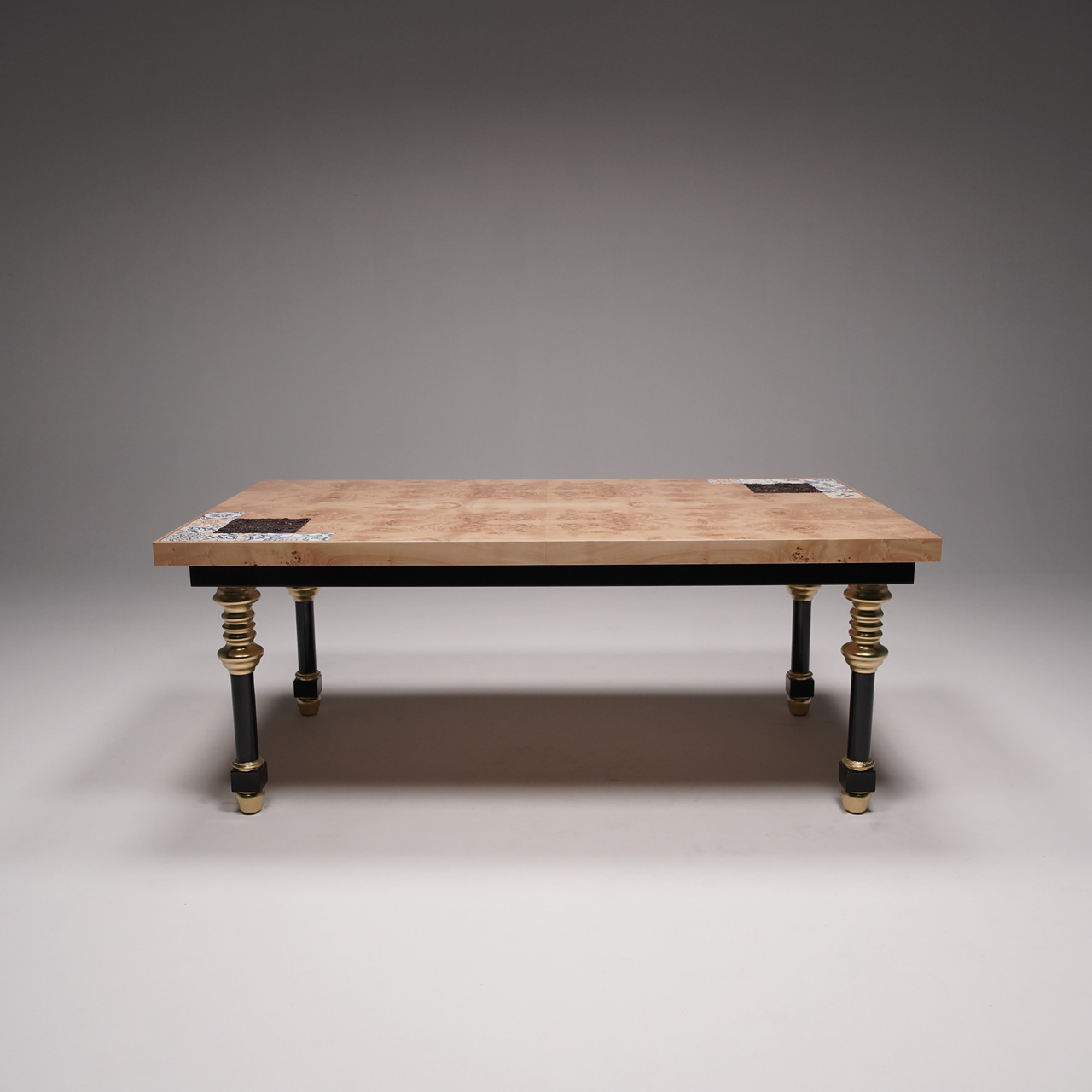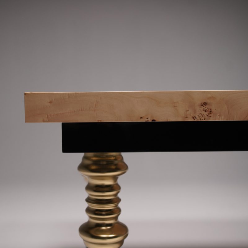 Miss Hilma has a beautiful story to tell you. One day, as if by magic, She was bewitched and transformed from a traditional table into a luxurious decorative piece. When she looked in the mirror, she was sturdily built, with the finesse of high-quality poplar root and pine bark detailing. Her light tone contrasts perfectly with the black lacquered legs and golden finishing.